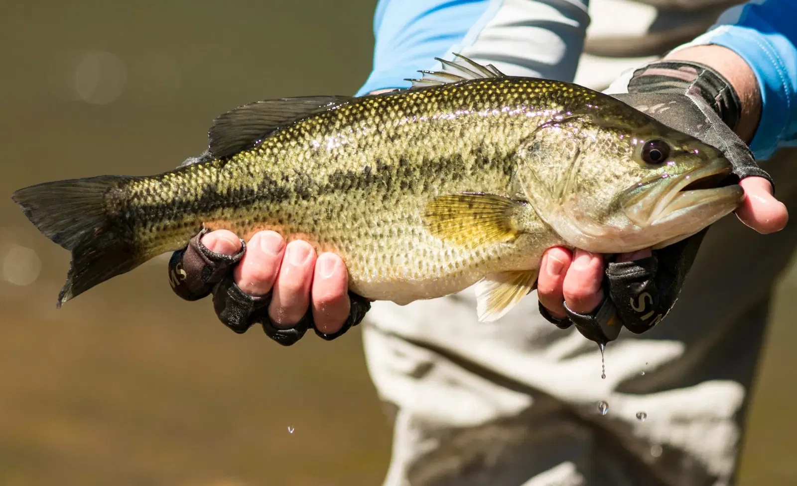 Spotted bass tend to be smaller and have a slimmer body shape than largemouth bass. They are distinct black or brownish, with small black blotches along their sides and back. They also have a tooth patch on the tongue, and their jawline is even with the eyeball. Their dorsal fin is connected to their other fin with one continuous fin.